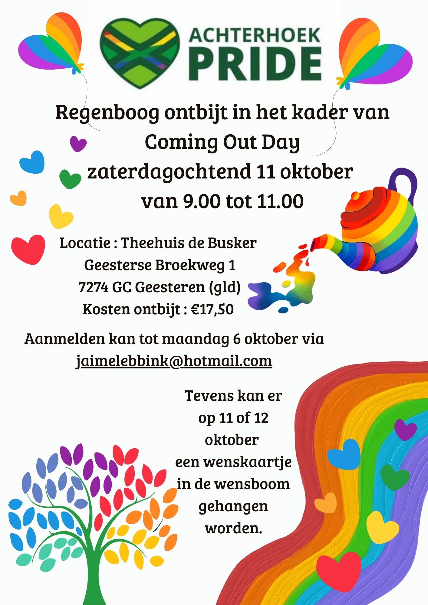 Op zaterdagochtend 11 oktober viert Berkelland Coming Out Day in theehuis de Busker in Geesteren, met een feestelijk regenboogontbijt. Voor €17,50 krijg je een heerlijk ontbijtje en kun je bovendien ter gelegenheid een wenskaartje in de wensboom hangen.